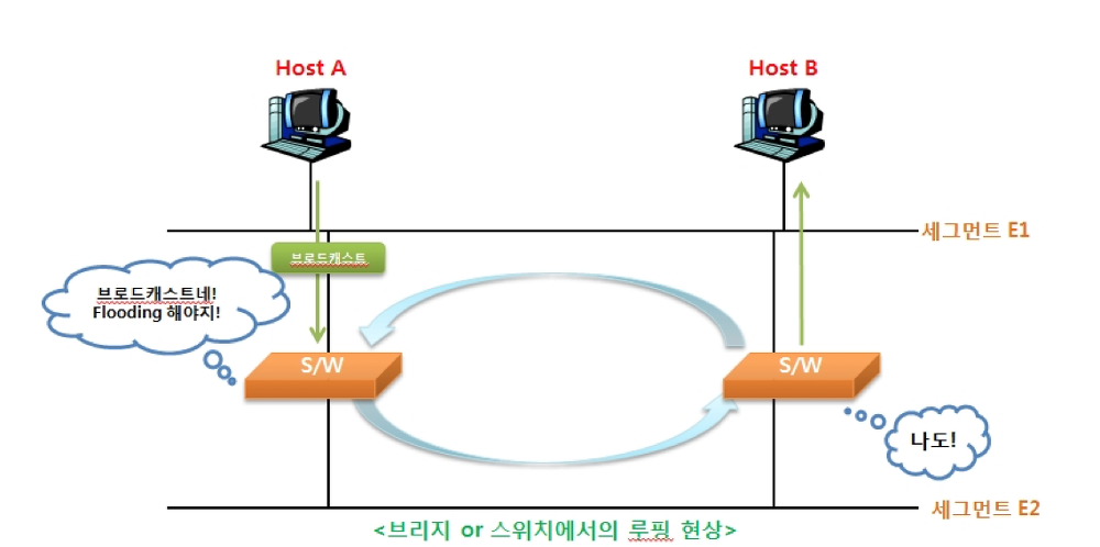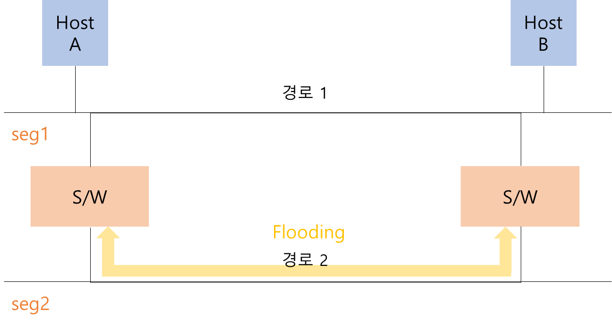 단순히 이렇게 보면 잘 구성된 네트워크 같이 보인다. 그런데 여기서 바로 위에서 말한 루핑 문제가 생긴다.