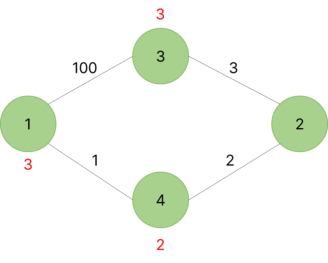 여기서 빨간 숫자는 목적지까지의 최소 가중치를 의미한다.