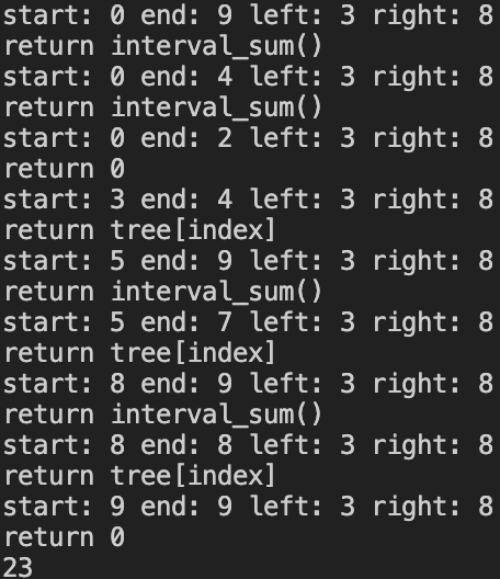 return intervalSum(start, mid, nodeIndex * 2, left, right) + intervalSum(mid + 1, end, nodeIndex * 2 + 1, left, right);
