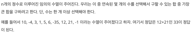 - 음수 값이 포함되어도 합이 최대 일 수 있다는 점
