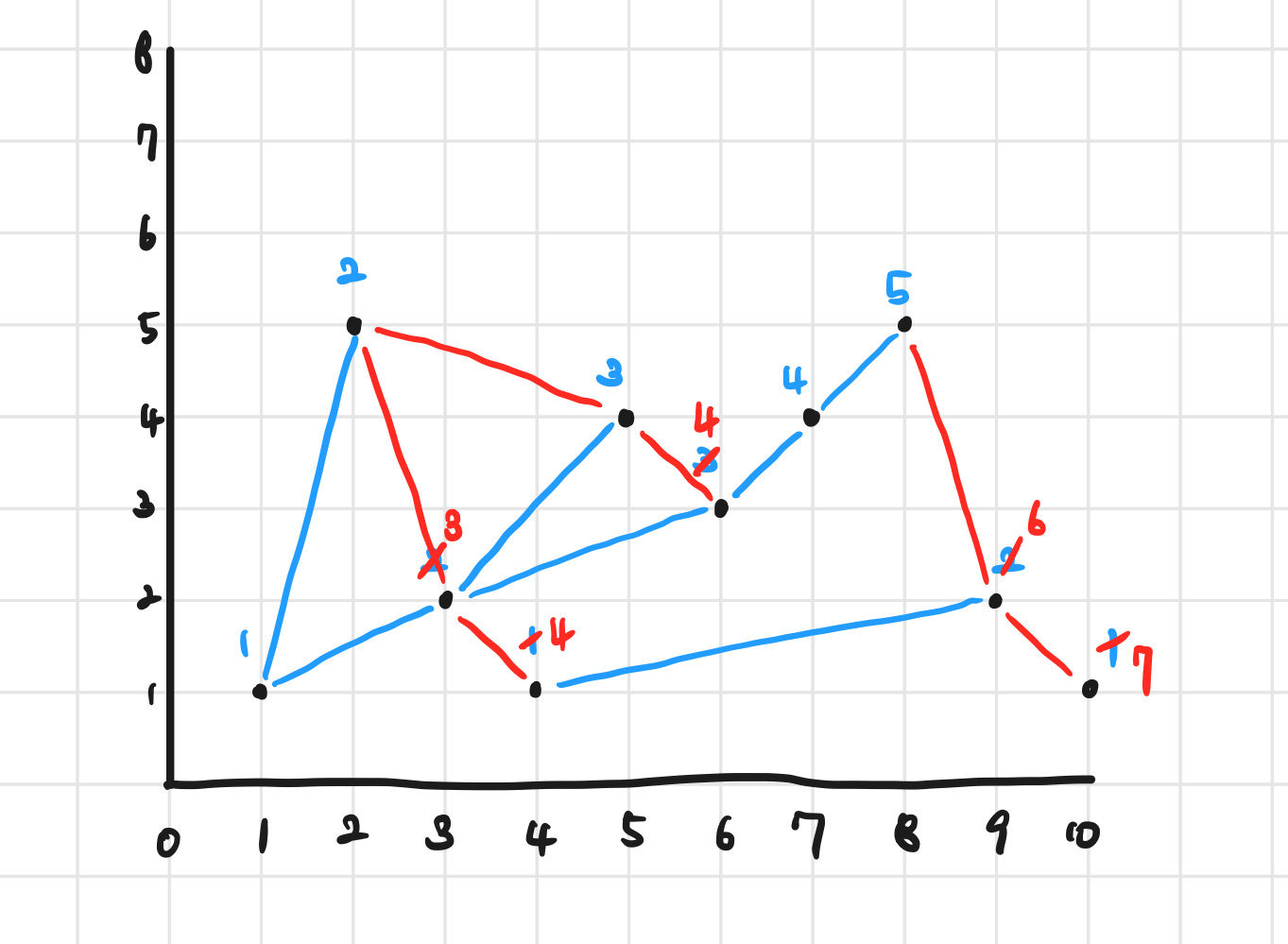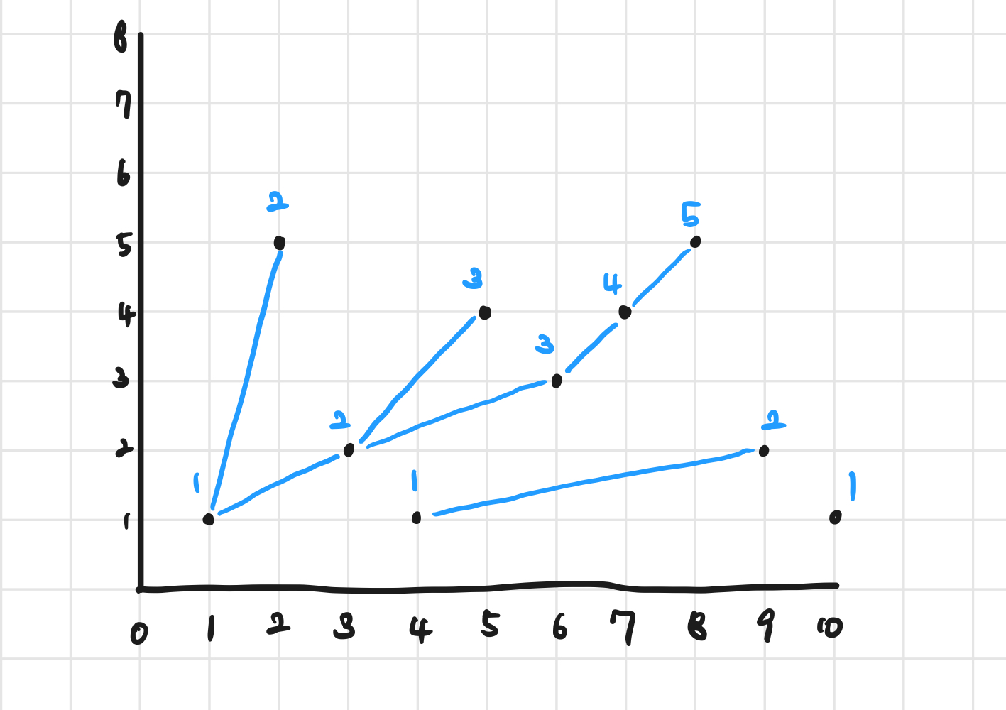 이렇게 증가하는 수열의 길이를 메모해놓고 감소하는 수열을 체크하여 메모된 값에 누적시키면 최대 길이를 찾을 수 있게 된다.