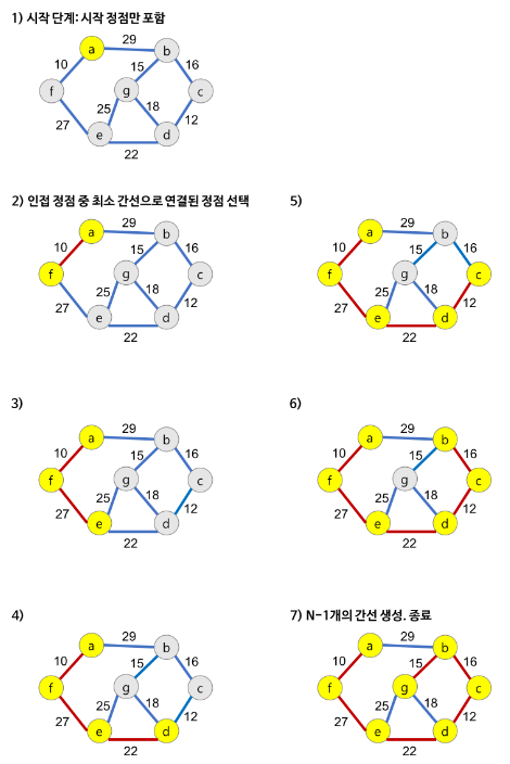- 모든 정점이 선택될 때 까지(n-1 개의 간선을 가질 때 까지) 반복한다.