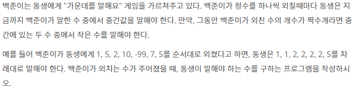 수가 순차적으로 주어지면 입력된 수 들 중에서 중간값을 계속 출력해나가는 문제이다 -> 짝수개 일 시 더 작은 값 출력
