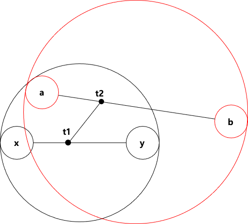 이 경우 정점 a로부터 가장 먼 정점인 b가 트리의 지름이 되려면 d(t2, t1) + max(d(t1, x), d(t1, y))의 길이와 d(t2, b)의 길이가 같아야 한다. 하지만 이렇게 되면 (x, y)는 트리의 지름이라는 가정에 모순된다.