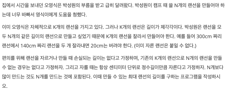 다양한 길이를 가진 n개의 랜선을 가지고 일정한 길이를 가진 k개의 랜선을 만들 때 만들 수 있는 최대 길이를 구하는 문제이다.