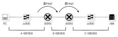 여기서 홉은 출발지와 목적지 사이에 위치한 경로의 한 부분을 말한다. 간단하게 보면 패킷이 한 라우터에서 다른 라우터로 이동하는 구간이라고 생각하면 된다.