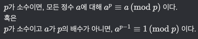 이 내용을 간단히 말하면, 임의의 소수 p와 서로소인 수 a에 대해, a^(p-1)을 p로 나눈 나머지는 무조건 1이라는 말이다.