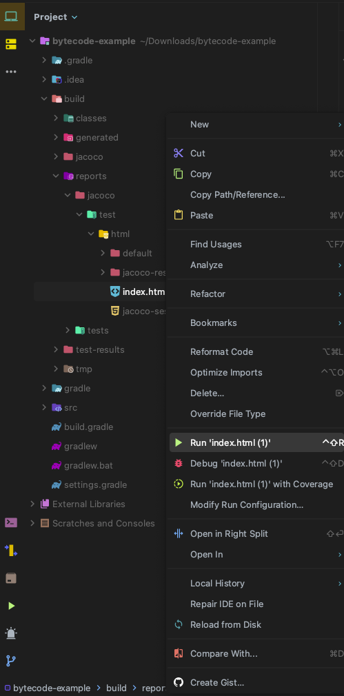 - jacocoTestReport: 바이너리 커버리지 결과를 사람이 읽기 좋은 형태의 리포트로 저장한다. html 파일로 생성해 사람이 쉽게 눈으로 확인할 수도 있고 xml, csv 같은 형태로도 리포트를 생성할 수 있다.