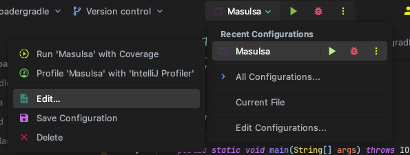 그럼 이제 원래 프로젝트로 돌아가서 main 메서드가 있는 Configurations에 들어가서 agent를 설정해보자.