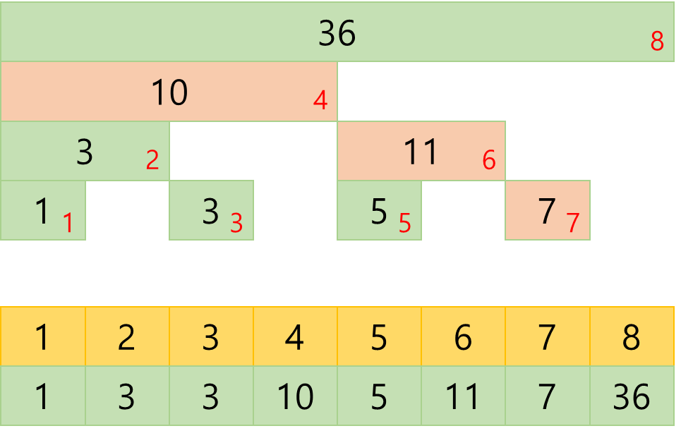 펜윅 트리는 다음과 같이 구성한다. 여기서 노란 블럭은 기존 배열, 초록 블럭은 트리 배열이다.